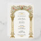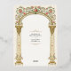 This elegant Victorian wedding invitation features a grand gold arch adorned with climbing vines of pink roses and delicate greenery. The intricate floral details and classic column design exude timeless sophistication and romantic charm. Perfect for couples seeking vintage-inspired wedding stationery with a luxurious aesthetic and a touch of floral elegance.
