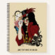 A black haired woman all in red victorian steampunk attire. Black tribal octopus, clock, blue butterfly and pink rose