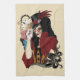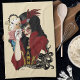 A black haired woman all in red victorian steampunk attire. Black tribal octopus, clock, blue butterfly and pink roses
