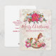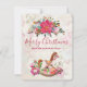 A festive Christmas flat card. The background is a vintage style collage with a faded image of pink roses, green leaves and french writing. Layered over top