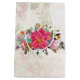 A festive Christmas gift bag. The background is a vintage style collage with a faded image of pink roses, green leaves and french writing. Layered over top