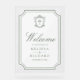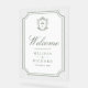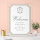 Elegant catholic wedding welcome sign featuring beautiful victorian crest with intricate details.