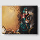 A warm orange-brown backdrop sets the tone for this steampunk wedding design, featuring a vintage clock, gears, and brown line art. At the centre, a Victorian couple—dressed in their finest steampunk attire
