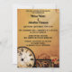 A warm orange-brown backdrop sets the tone for this steampunk wedding design, featuring a vintage clock, gears, and brown line art. At the centre, a Victorian couple—dressed in their finest steampunk attire