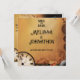 A warm orange-brown backdrop sets the tone for this steampunk wedding design, featuring a vintage clock, gears, and brown line art. At the centre, a Victorian couple—dressed in their finest steampunk attire