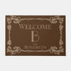 This elegant Victorian vintage style welcome mat features a medium brown coloured background. A decorative beige border frames the doormat. The centre features a large monogram Initial in a matching beige to represent the first letter of the family name. A sample family name is printed below the initial and the greeting "Welcome" is printed near the top.