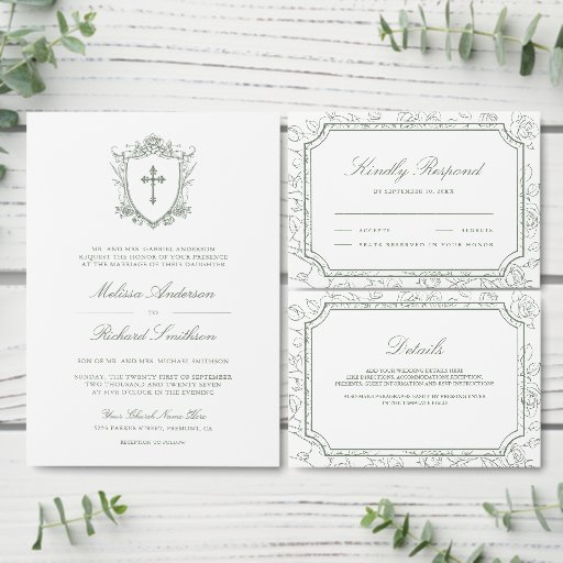 Victorian White and Sage Green Catholic Wedding Save The Date