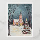 Pink chapel on a snowy evening with decorated christmas trees; "merry christmas" in ribbon style in gold foil, open full editor to delete and add your own greeting. Editable year on front and text on back. Original illustration by Becky Nimoy.