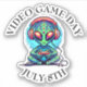 July 8th is Video Game Day. Funny alien playing video games in a pixel art form.