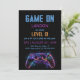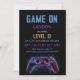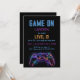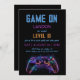 This cool stylish video gaming birthday party invitation features a neon glowing game controller design with typography and script font in teal and purple on a black background.. Perfect for celebrating a gamers birthday in style, this invitation is sure to impress your guests. Perfect for a boy or girl teen birthday parties. The invitation can be personalised to include your name, party details, and any other special information you want to include. Get ready to host the coolest video game party with this unique eye-catching invitation.
