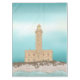 An illustration of Vieste lighthouse in Italy. This lighthouse is drawn standing on its Rocky Island. The theme of the lighthouse is lighting up the dawn or dusk sky. It is also known as Isola Santa Eufemia. It is located between the rocks of Santa Croce and San Francesco, just opposite the town of Vieste, Apulia,