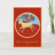 Personalise with your New Year message inside. It features a golden sheep on a meadow of red with a tree and flowers of yellow gold and red against a blue sky.