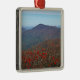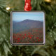 A photograph of the mountains and fall foliage with blue skies behind them from the top of Craggy Dome in North Carolina. Red flowers sit in the foreground.