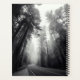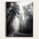 This black and white photo features a low angle view of Sequoia Trees in a forest in California.