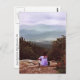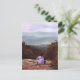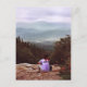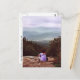 This postcard features photography of one of the wonderful hikes in the White Mountains of New Hampshire. A hiker has followed the Nancy Pond Trail all the way to the Norcross Pond outlet which affords spectacular views of the Pemigewasset Wilderness, Mt. Bond, the Twin Range and the Franconia Mountain Range. He has laid his hiking stick on the rocks and is resting on a large granite slab. He is wearing a red bandanna and a lilac purple shirt which says: Support Jazz. The vista is magnificent with sky and mountains in a colour range of blue, green and mauve.