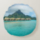 Round throw pillow with a luxury overwater thatched roof bungalow resort in a vacation resort in the clear blue lagoon with a view on the tropical island of Bora Bora, near Tahiti, in French Polynesia.