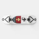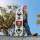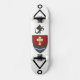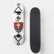 The skateboard design features two fantastical alien symbols flanking a central shadow of a dragon, encapsulating a sense of mystery and power. This intricate composition is set against a white background, complemented by an old retro-style shield in a light beach hue, specifically light brown, adorned with a cross. Together, these elements symbolise strength and endurance, merging whimsical artistry with a classic aesthetic.