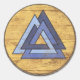 Cool stickers featuring the classic Valknut design over beautifully weathered wooden Viking shield background.