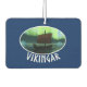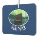 A slightly stylised image of a viking longship sailing at night under the Northern Lights there a couple of icebergs; most of the crew is asleep. Text reading "VIKINGAR" (Vikings) also appears.
