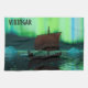 A slightly stylised image of a Viking longship sailing at night under the Northern Lights there a couple of icebergs; most of the crew is asleep. Text reading "VIKINGAR" (Vikings) also appears.