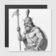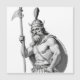 Black and white illustration of a muscular Viking or Nordic warrior. He wears a horn helmet decorated with a feather or a plume, and a cape. The character holds a spear or a hallebard in his left hand and has an imposing physics, with an athletic and muscular body. Her face is marked by a severe expression, with an intense look and a dense beard. The style of the illustration is very detailed, resembling a sculpture or a technical drawing with a great concern for realism and anatomical details.