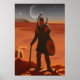 A viking warrior with armour and shield standing on the red planet Mars with two moon on the sky. This is a AI generated art.