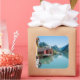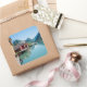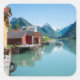 Square souvenir sticker of a landscape with boathouses in the village of Fjærland (Mundal) and mountains with reflection in the water of the fjord Fjærlandsfjord, Sogn og Fjordane in Norway.