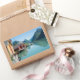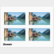Rectangular souvenir photo sticker of a landscape with boathouses in the village of Fjærland (Mundal) and mountains with reflection in the water of the fjord Fjærlandsfjord, Sogn og Fjordane in Norway.