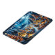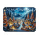 A picturesque Christmas village illuminated by lights, featuring decorated trees under a starry night sky.