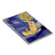 The blue night sky is filled with swirling clouds, stars, and a bright crescent moon.