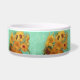 Artistic beautiful floral vintage fine art painting featuring twelve sunflowers in a vase against a turquoise background.