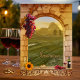 An artistic painted wedding invitation with a vineyard theme. This invitation features a landscape in Italian style with a Roman arch, grapes, wine and a sunflower. You can replace the landscape image with a custom picture if you like. It is also possible to replace the front text image with your own text. All texts on the back can customised, including change of fonts, font sizes and more. For all customising options, choose "customise it".