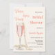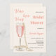 A modern, stylish and glamourous invitation for a Vino before Vows Bridal Shower. A soft cream, beige background with a glass, flute with pink bubbles and pearls. The name is written with a modern hand lettered style script. Personalise and add your party details.