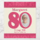 Pink and cream ribbon and fleur-de-lis patterned girls 70th birthday wine, spirits or drinks labels. Reads Margaret 80 Vintage 1958 aged to perfection, customise with your own birthday girls name vintage birth year and a photos of your choice, in the 0 of 80. A great way to customise your gift of wine. Matching wine box also available. © Designed by Sarah Trett. www.sarahtrett.com for www.mylittleeden.com
