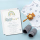 Celebrate your little one on the way with this cute, customizable baby shower invitation! This watercolor design features a fun vintage airplane in soft baby blue and yellow colors pulling along a party banner that spells out "boy!". A beautiful rainbow of green, blue and yellow arches soar above white puffy clouds.