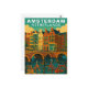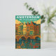 Capture the vibrant and cozy spirit of the Dutch capital with this beautiful Amsterdam, Netherlands Travel Card. This vintage-style illustration features a row of iconic, multi-colored gabled houses reflecting in the serene waters of a city canal.