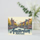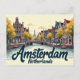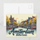 This retro postcard captures the classic spirit of Amsterdam with its scenic canals, narrow houses, and charming bicycles under soft golden light. A nostalgic tribute to the Netherlands’ vibrant capital, ideal for vintage lovers, travelers, and collectors of European charm.