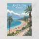 Capture the sunny charm of the Turkish Riviera with this vintage-style travel poster postcard. This stunning illustration showcases Antalya, Turkiye, featuring a beautiful sandy beach, turquoise Mediterranean Sea, lush palm trees, and the dramatic backdrop of coastal mountains. The design has a classic retro tourism feel, perfect for sending to a friend, adding to a travel-themed collection, or framing as a piece of exotic, wanderlust-inspired wall art. Ideal for lovers of beaches, summer vacations, the Mediterranean, and retro poster art.