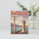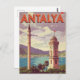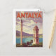 This historic Vintage Antalya Travel Poster Postcard captures the charm of the Turkish Riviera, featuring the city's iconic landmarks: the Clock Tower (Saat Kulesi) and a towering Minaret overlooking the harbour and Mediterranean coast.