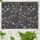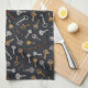This kitchen towel features hand-illustrated vintage and antique keys for safes and locks on a dark blue background.