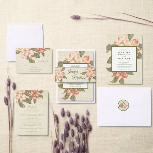 This beautiful apple blossom wedding coaster features vintage apple blossom drawings on a parchment damask background with the bride and groom's initials in the centre. The initials are combined with an oversized ampersand in a white box with a green decorative border.