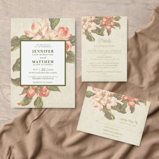 These beautiful apple blossom wedding stickers feature a vintage apple blossom drawing on a parchment damask background with the bride and groom's name in curved green text along the outside edge.