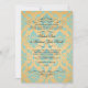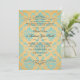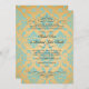 Vintage Wedding Invitation style with black text and black swirls and flourishes on a stained paper graphic with aqua blue damask pattern. Customisable with your names and wedding invitation text. Design by Elke Clarke ©2011. For customisation please contact luxuryweddinginvitations@ gmail.com. Graphics licensed. More selection at www.luxurywewddinginvites.com.