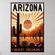 • This vintage Arizona travel poster captures the serene beauty of the desert landscape with its iconic tall saguaro cacti and a bold sunset radiating warmth. The rich tones bring out the essence of Arizona's desert scenery, creating a nostalgic, art deco feel reminiscent of classic 1930s travel posters.