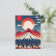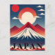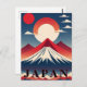 Celebrate the Land of the Rising Sun with this bold Japan Travel Postcard. This unique Geometric Art Deco design features the iconic snow-capped peak of Mount Fuji set against a massive, stylized red sun and vibrant blue sky.