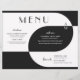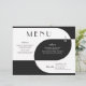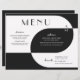 These vintage art deco style 11" x 8.5" wedding dinner paper sheet menus black and white lettering with geometric design in black and white on a black background. The menu has placeholders for 2 appetizers, 2 entrees, and 2 desserts and the wedding couple initials.