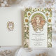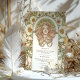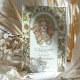 This Art Nouveau-inspired wedding menu card is a masterpiece of vintage elegance and botanical charm. The front showcases a graceful Art Nouveau woman framed by delicate floral illustrations of soft white flowers, greenery, and intricate patterns in sage green, pale peach, and warm yellow. Beautifully designed, the menu presents an exquisite selection of courses, perfect for a sophisticated dining experience. The back features a minimalistic "Menu" emblem with artistic floral motifs, adding a refined touch. Ideal for weddings and formal events, this menu card brings timeless beauty and elegance to any table setting.