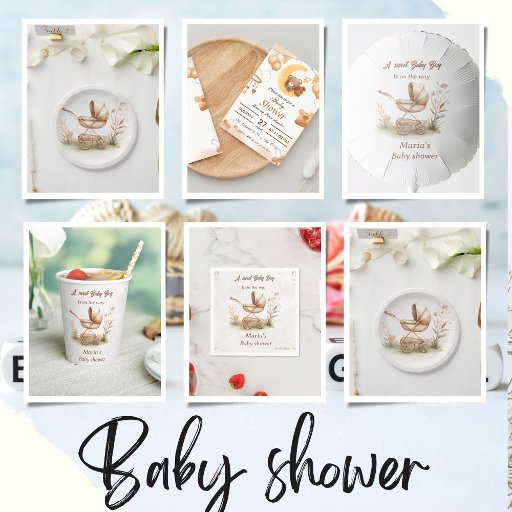 This elegant paper napkin features a delicate, watercolor-style design perfect for a baby shower celebration. The illustration showcases a vintage-style baby carriage in soft sepia tones, surrounded by gentle floral and grass elements in muted brown and green hues. The text reads "A sweet Baby Boy Is on the way" at the top, followed by "Maria's Baby shower" and includes the date "20-06-2025". The overall colour palette maintains a sophisticated, neutral aesthetic with warm brown tones on a cream background.