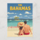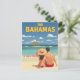 This romantic Vintage Bahamas Travel Poster Postcard captures the idyllic beauty of the Caribbean, featuring a stylish couple relaxing on a white-sand beach with a flock of iconic Flamingos and a tiny tropical island in the background.