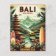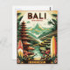 • This retro-style travel postcard captures the beauty of Bali, Indonesia, featuring lush green rice terraces, tropical palm trees, traditional Balinese architecture, and a majestic volcano under a serene sky.